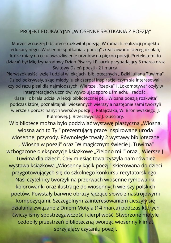 Co można pielęgnować? Pytanie proste, aczkolwiek zmusza do zastanowienia się. Otóż pielęgnować można ciało, pielęgnować można chorego, pielęgnować można rośliny… Pielęgnować można też…język! I tak właśnie działo się w Naszej szkole. Ze słowem: ,,pielęgnować” łączy się systematyczność. Stąd w nawiązaniu do Międzynarodowego Dnia Języka Ojczystego, przy zaangażowaniu Rodziców, …