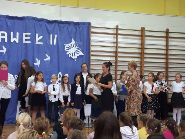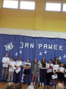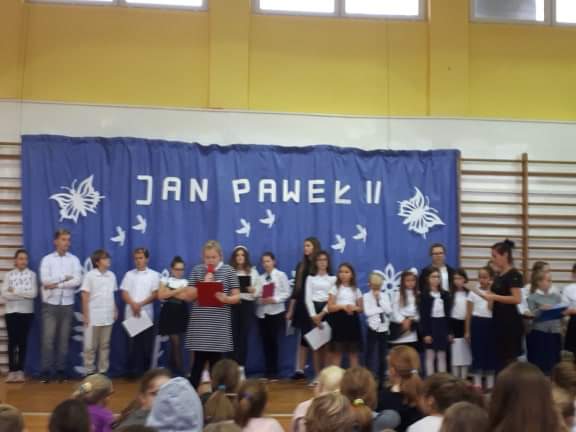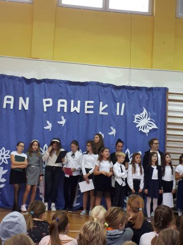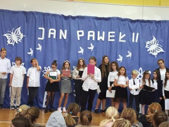 Dnia 16 października 2019 roku odbył się w naszej szkole apel z okazji 41 rocznicy wyboru kard. Karola Wojtyły na papieża Jana Pawła II. W apelu wzięli udział uczniowie klas 6b i 6c oraz zespół muzyczny  pod kierunkiem pań: Marty Wolak- Nazir i pani Danuty Cybuli. Nad obsługą sprzętu czuwał pan Arkadiusz Paczyński, a salę przystroiła pani Alicja Godlewska. Uroczysty apel zakończyły gromkie brawa z sali.