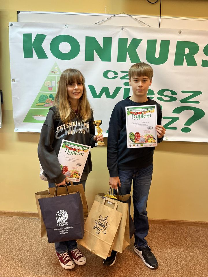 W dniu 11.04.2024 w Zespole Szkół Ekonomicznych odbył się XVIII Powiatowy Konkurs „Czy wiesz co jesz?”. Naszą szkołę reprezentowali uczniowie klasy 7 c Paulina Markowicz i Arkadiusz Markowicz, którzy zdobyli III miejsce w kategorii szkół podstawowych. Serdecznie gratulujemy i życzymy kolejnych sukcesów!