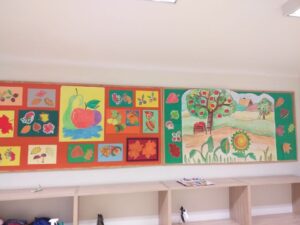 a stopniowo dołączały do nich inne prace. Dzieci wykonywały bardzo chętnie piękne prace plastyczne wykorzystując barwy i skarby jesieni tworząc tym samym cykl zajęć poświęconych tematyce jesiennej z których powstały efektowne, barwne wystawy. Nadały one jesiennego klimatu w naszej szkole i cieszyły się dużym zainteresowaniem.