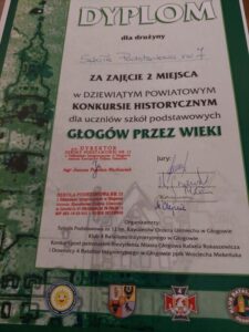 Miło nam poinformować, że uczniowie naszej szkoły:  Wojciech Filipek 8c,  Marcin Tywoniuk 8b, Ewa Wójtowicz 8f  zajęli  II miejsce w Dziewiątym Powiatowym Konkursie Historycznym ,, Głogów przez wieki”.