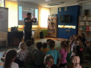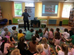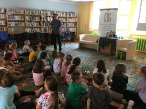W piątek 20 maja w Miejskiej Bibliotece Publicznej nasi drugoklasiści spotkali się z autorem książek dla dzieci i młodzieży – Krzysztofem Petkiem. Uczniowie w sposób humorystyczny i bardzo ciekawy zostali zapoznani z twórczością pana Petka. Dowiedzieli się, że autor jest organizatorem wielu wypraw i szkół przetrwania, z których czerpie pomysły do pisania książek.
