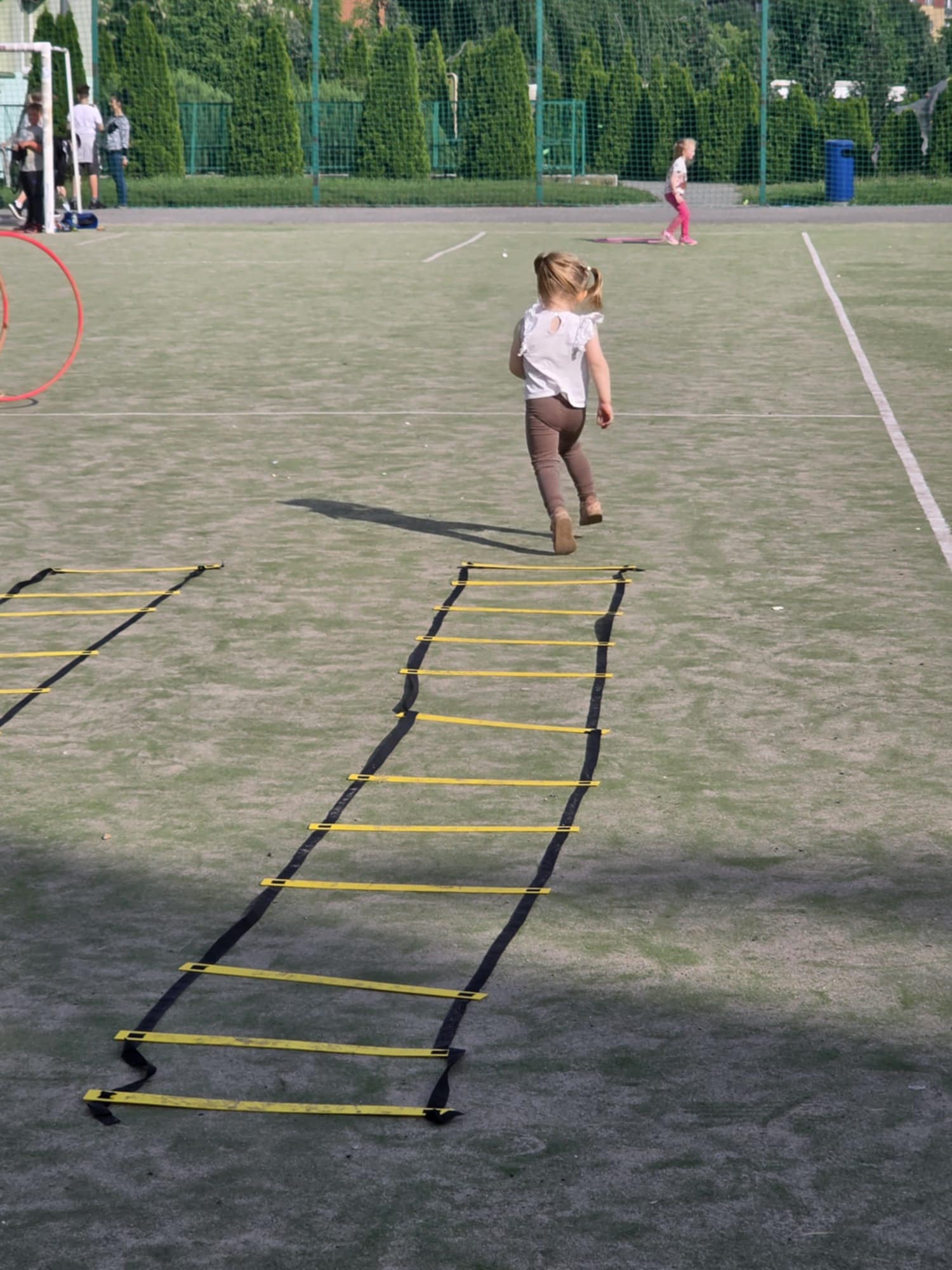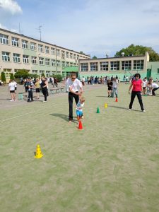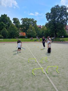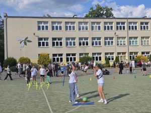 Zadaniem było dobranie się w dwójki (rodzic+dziecko, brat+siostra, koleżanka+kolega) i wspólne pokonanie toru zwinnościowego. Obejmował on przejście slalomem na „trzech” nogach, skoki przez przeszkody, przenoszenie w nietypowy sposób piłek, rzuty do celu. Zabawa przyniosła dużo uśmiechu i zadowolenia wśród uczestników.