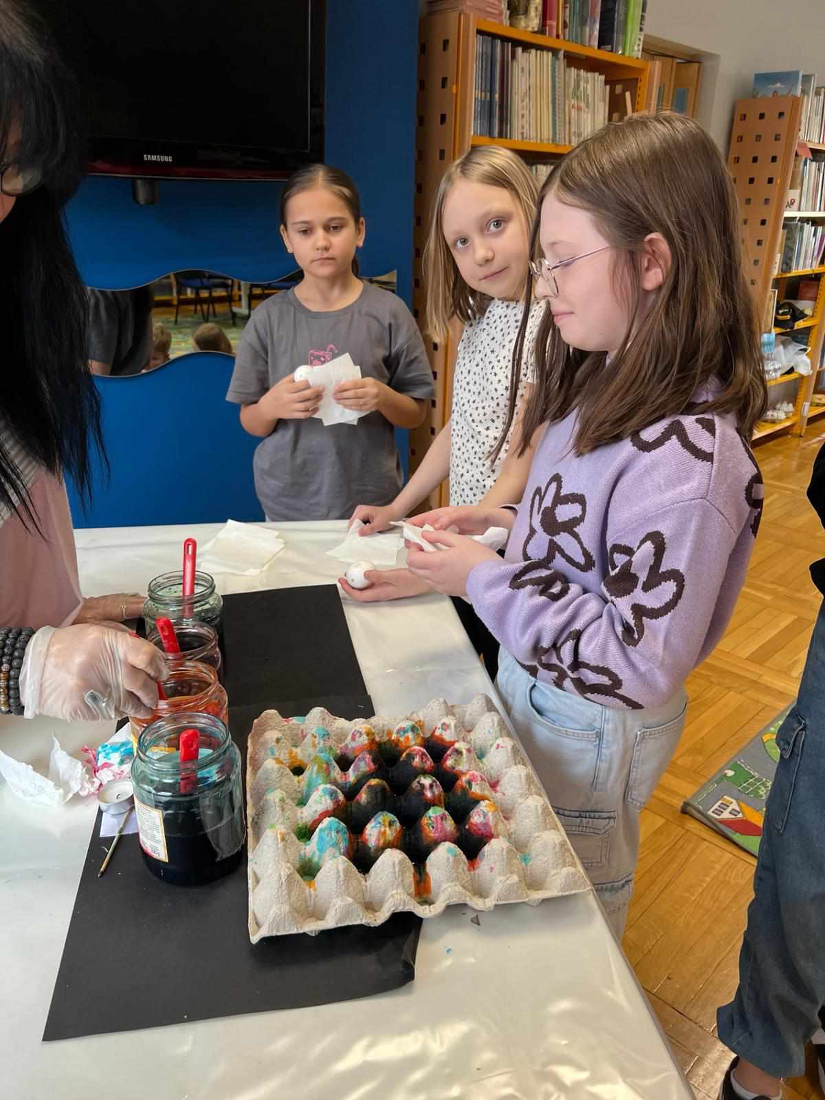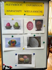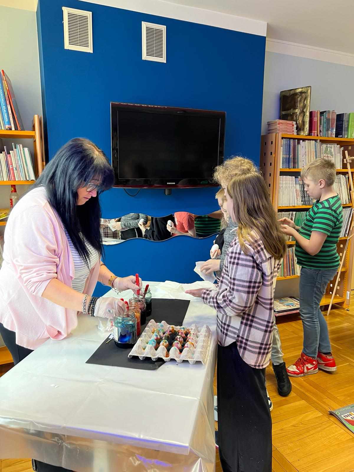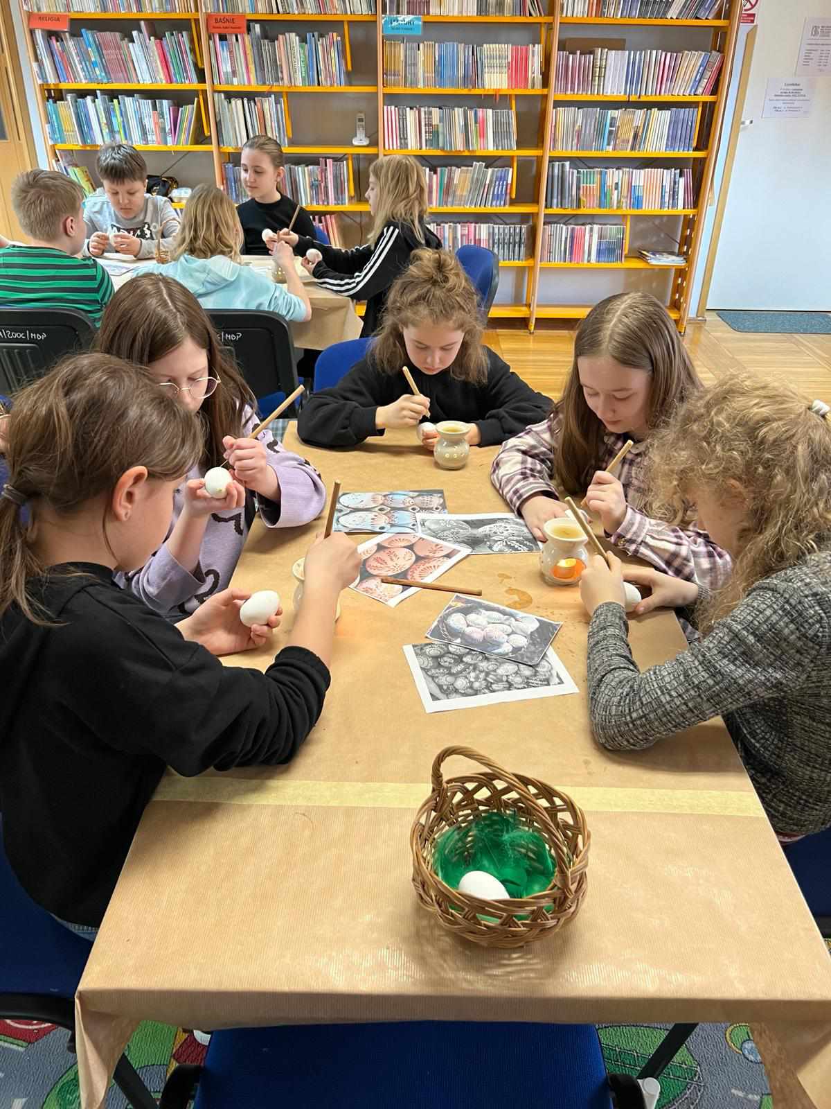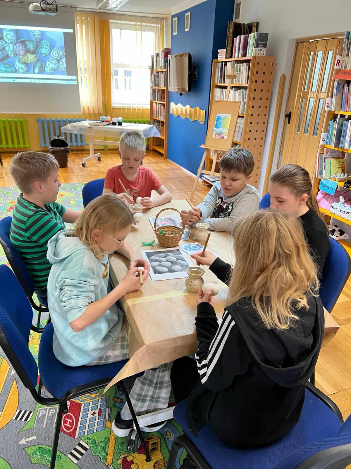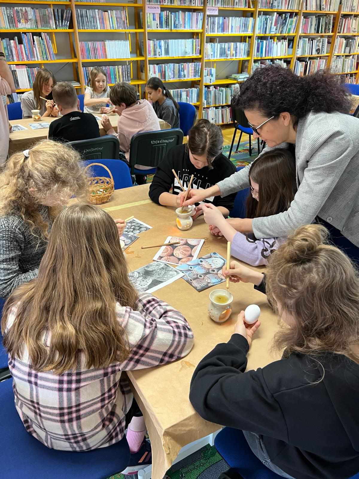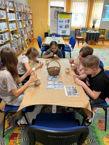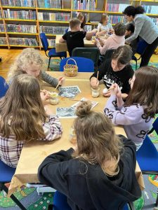 Dnia 22.03.2024 r. uczniowie klasy IV a uczestniczyli w warsztatach wielkanocnych pod hasłem „Przywrócić zapomniane”, które odbyły się w Dziale Dziecięco – Młodzieżowym Miejskiej Biblioteki Publicznej w Głogowie. Uczestnicy warsztatów utrwalili i poszerzyli swoje wiadomości o tradycjach świątecznych. Panie prowadzące podzieliły się swoją wiedzą na temat sztuki malowania pisanek. Wszyscy uczniowie otrzymali własne wydmuszki i za pomocą specjalnego pisaka (drewienka w kształcie ołówka z wbitą w nie szpilką) nanosili na skorupki jajek rozgrzany wosk pszczeli, tworząc w ten sposób piękne wzory. Gotowe pisanki zostały zabarwione w specjalnych farbach na wybrany przez uczniów kolor. Było kreatywnie i twórczo!